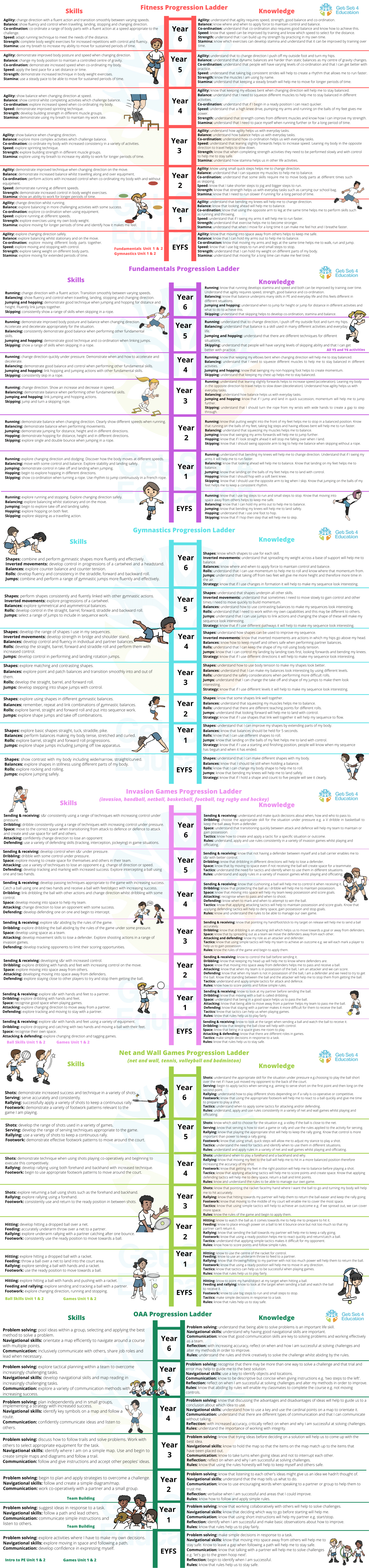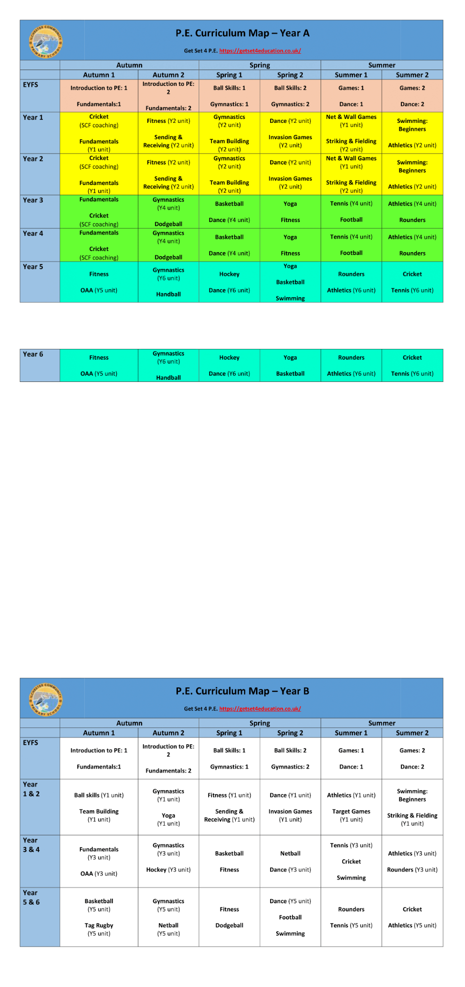 Using the EYFS Statutory Framework and National Curriculum, age-appropriate progression in knowledge and skills for P.E. has been identified and mapped out across Key Stages in a two-year rolling programme.