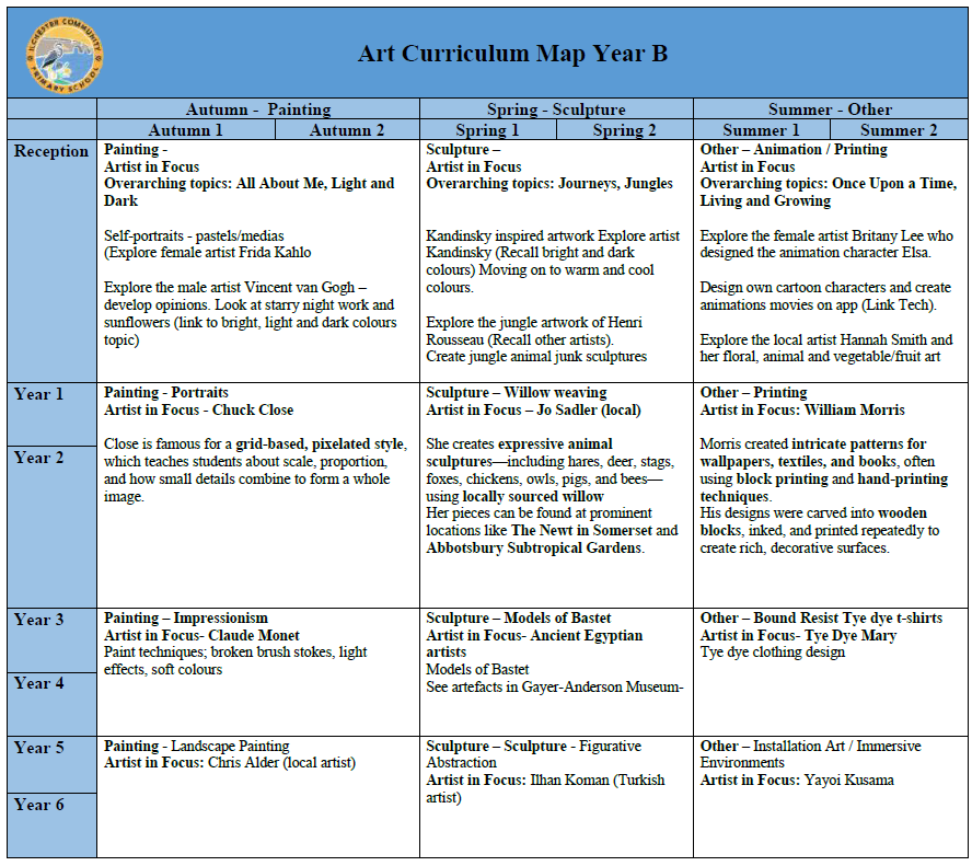 At Ilchester Community Primary School, we believe art is a vital part of every child’s education. As the National Curriculum states, “art, craft and design embody some of the highest forms of human creativity.” Nurturing creativity is essential—not only for its impact on other areas of learning but for its intrinsic value. We are committed to providing every child with opportunities to be inspired by art and design and to achieve success through it.